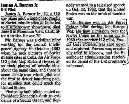 Obituary- Corrections The WASHINGTON POST 1150 15th, ST. NW. WASHINGTON, DC 2OO71 Dear Sirs, There is a serious mistake in the OBITUARY Column of the July 15th issue of the POST. A correct reference has been made to the death of "James A. Barnes formerly a U-2 spy-plane pilot whose photographs of Soviet missile sites led to a Super-Power showdown'" The following is a major error The Obituary also reports that: "He flew a mission over the Soviet Union on the same day in 1960 that another U-2 pilot, FRANCIS GARY POWERS, was shot down and captured." THIS ABOVE REFERENCE THAT FRANCIS GARY POWERS WAS SHOT DOWN IS ABSOLUTELY UNTRUE. THE POWER U-2 WAS ON AN OFFICIAL U.S, AIR FORCE MISSION AND AS THE AIR FORCE AS CONFINED THAT POWER"S U - 2 WAS NOT SHOT DOWN. That U-2 had been craftily prepared before its take-off from Pakistan so that when it reached an extremely high altitude, 80,000 or more, its engine/fuel combination would fail and would force Powers to glide to a safe landing in Russia. During the Power's trial in Moscow many other unusual preflight actions were exposed that reveal how that U-2 was prepared for an unplanned landing. There are plenty of official U.S, Air Force documents that reveal that this is the actual story of that flight. L. FLETCHER PROUTY COL. USAF (RET'D)